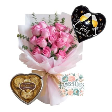 Ramo 12 Rosas Rosadas + Bombones Ferrero + Globo