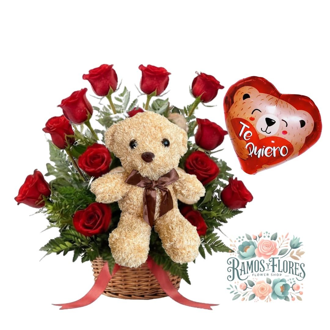 Arreglo 12 Rosas Rojas + Peluche + Globo