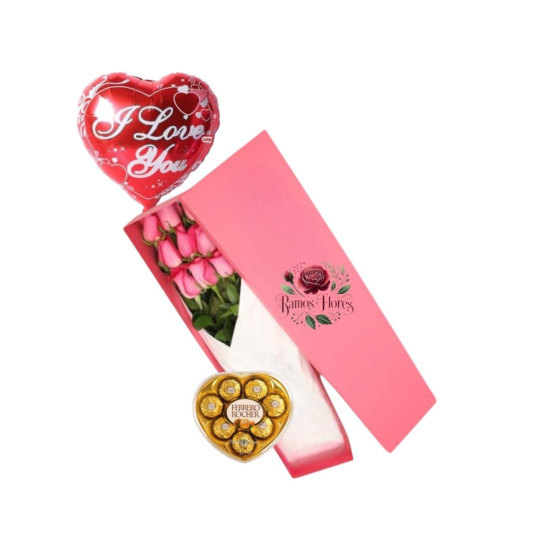 Caja 9 Rosas Rosadas + Bombones Ferrero + Globo