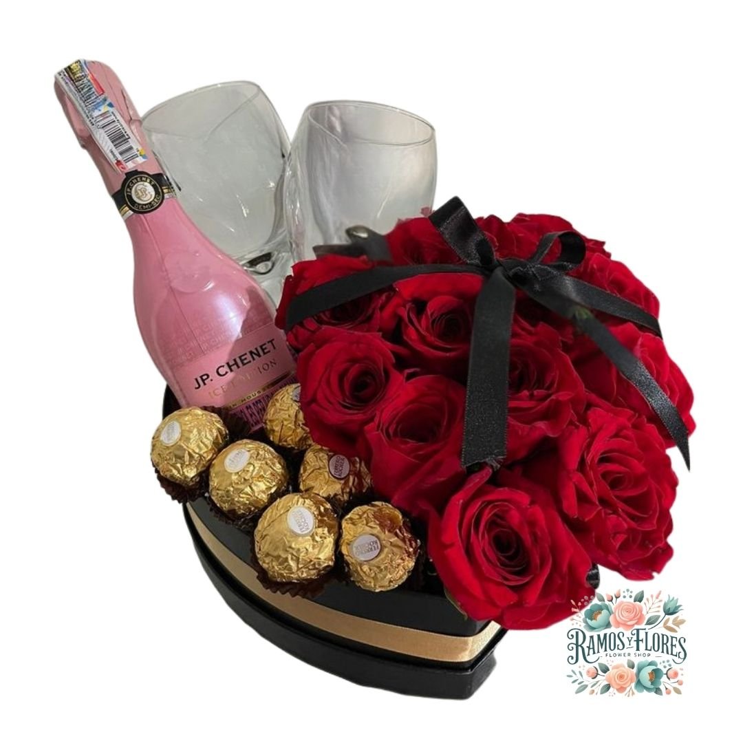 Box Corazón 10 Rosas + Espumante Jp Chenet Ice Rosé + 2 Copas de Vidrio Espumante + Bombones