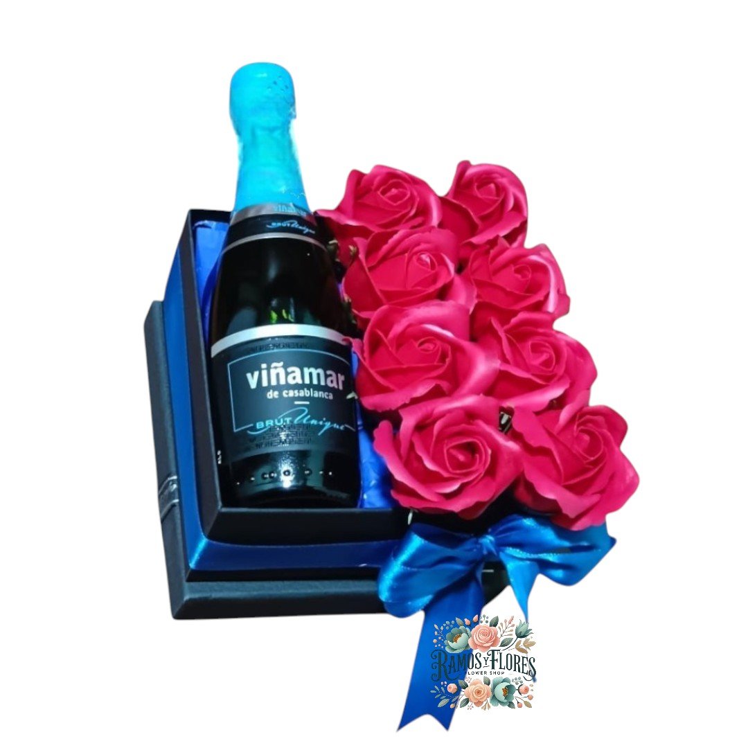 Box Cuadrado 8 Rosas Eternas De Jabón + Vino Espumante Valdivieso 187cc